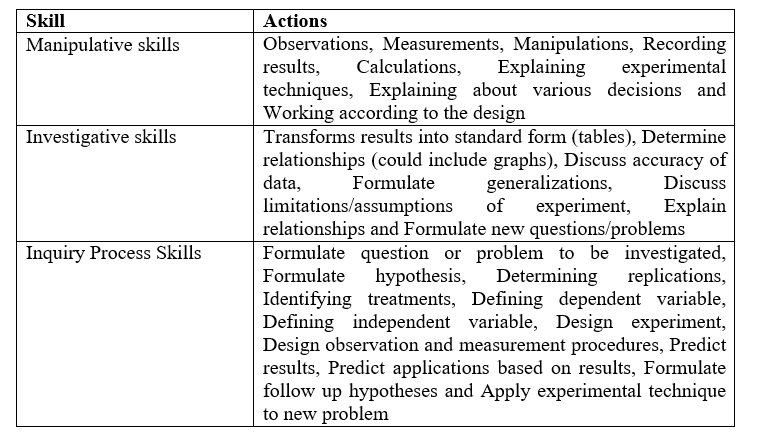 Inquiry Skills - The students are said to have developed these skills if they are able to carry out the following tasks - Formulate question or problem to be investigated, Formulate hypothesis, Determining replications, Identifying treatments, Defining dependent variable, Defining independent variable, Design experiment, Design observation and measurement procedures, Predict results, Predict applications based on results, Formulate follow up hypotheses and Apply experimental technique to new problem.