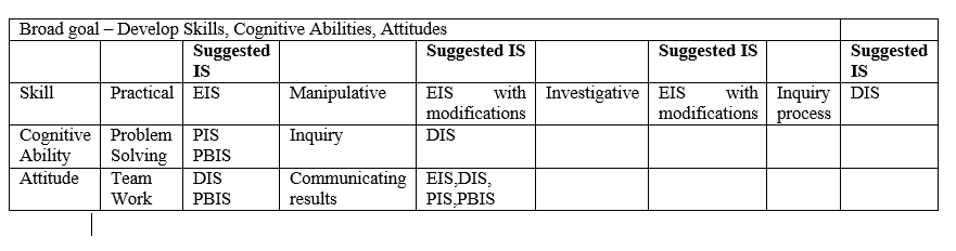 Investigative skills - The students are said to have developed these skills if they are able to carry out the following tasks - Transforms results into standard form (tables), Determine relationships (could include graphs), Discuss accuracy of data, Formulate generalizations, Discuss limitations/assumptions of experiment, Explain relationships and Formulate new questions/problems.