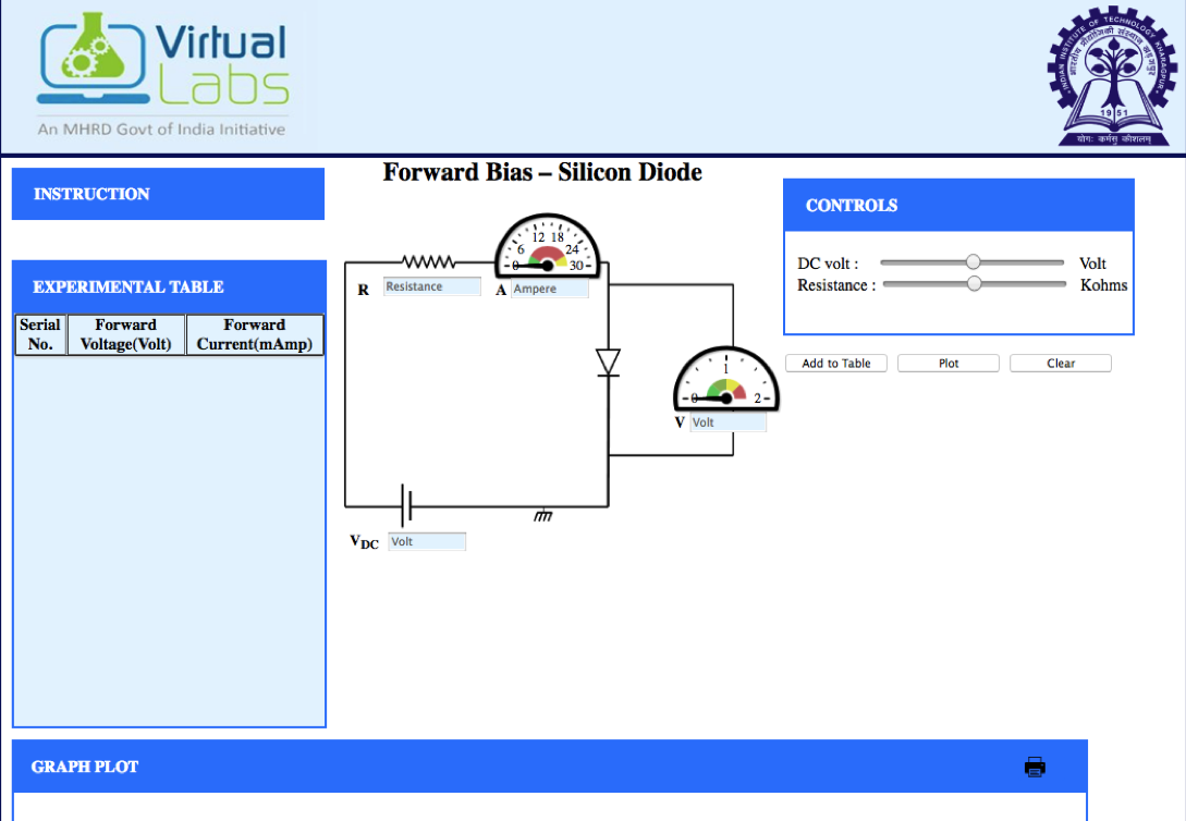 Tasks: Construct the given circuit. Measure the current flowing through the diode at various values of applied DC voltage. Note down the readings for ten values. Plot the graph of current vs. voltage to obtain the V- I Characteristics of the PN junction diode. Calculate the static and dynamic resistance of the diode from the formulae given in the linear and non-linear region of the characteristics.